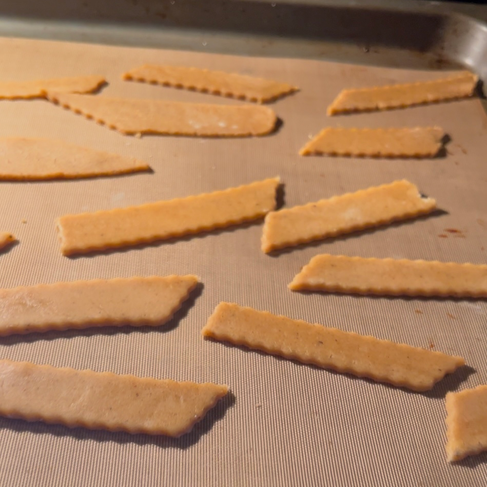 Stek pinnene i ca 10 minutter, men følg med og ta de ut når de er gylde. Avkjøles på rist.